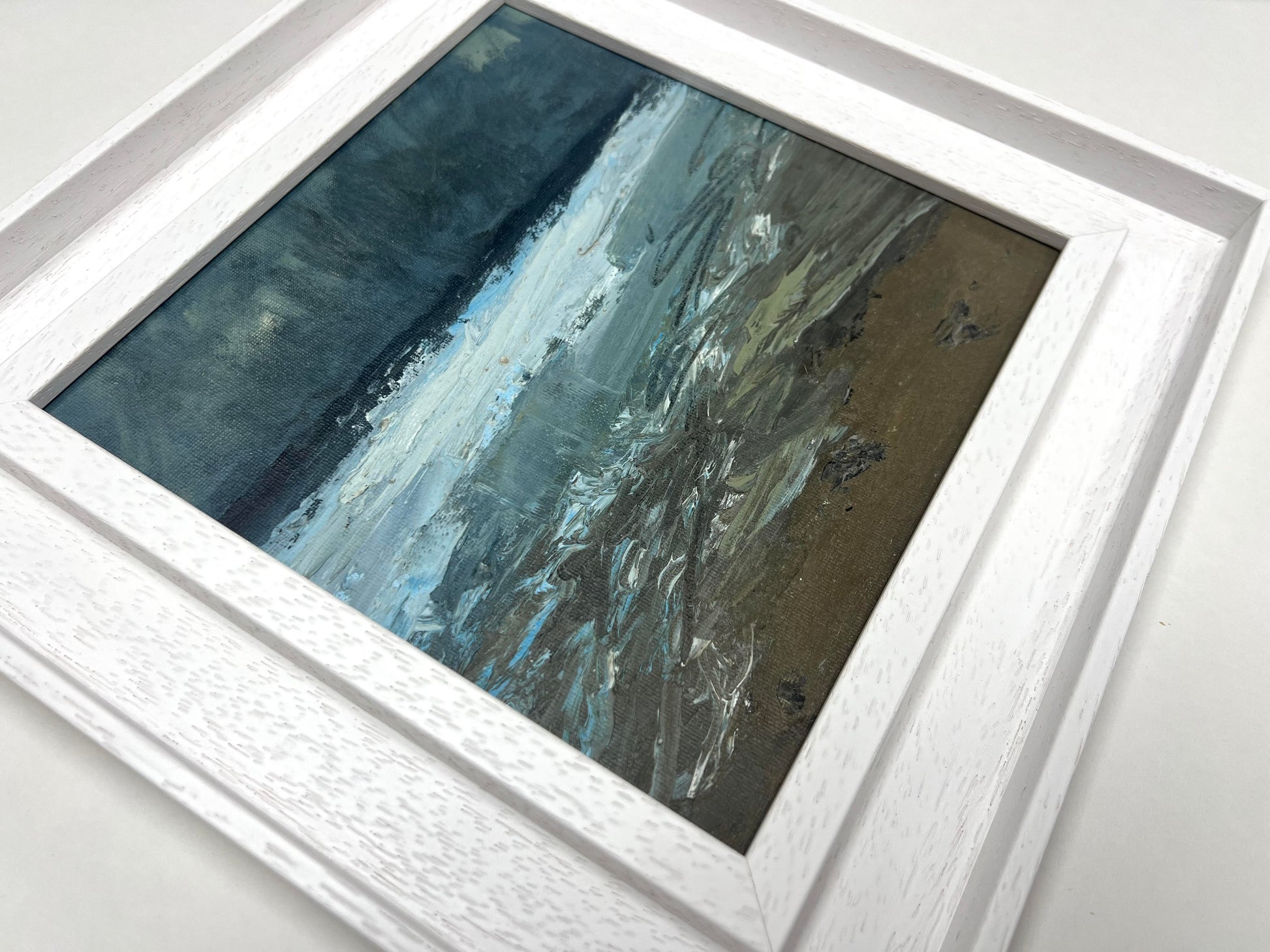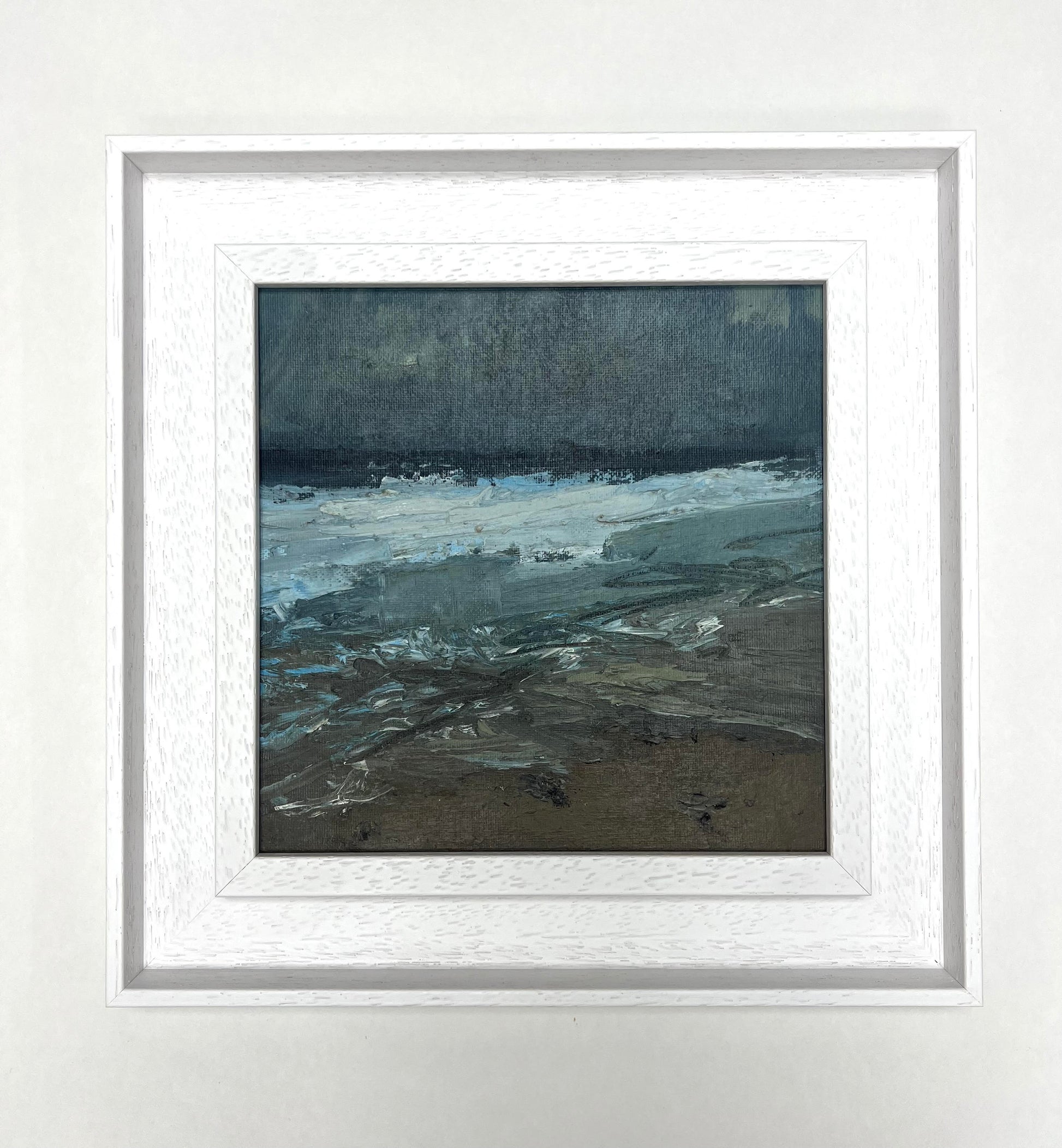 Framed in white solid wood frame.