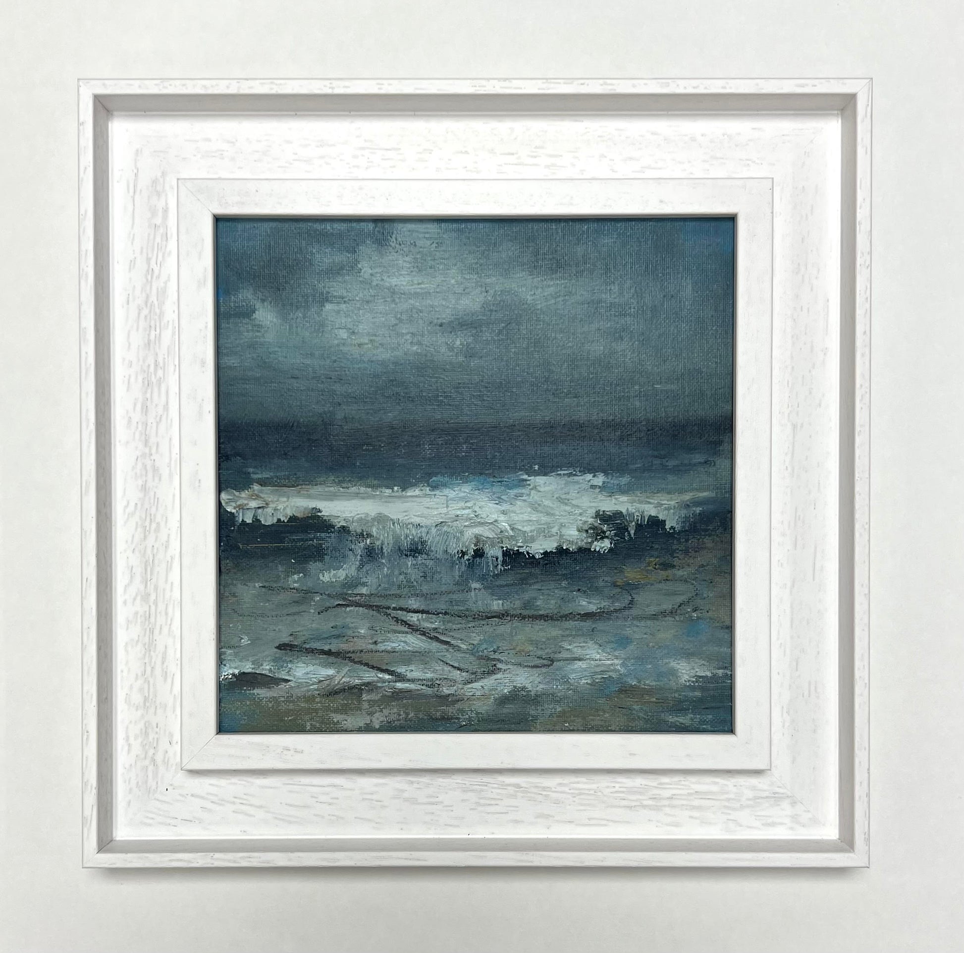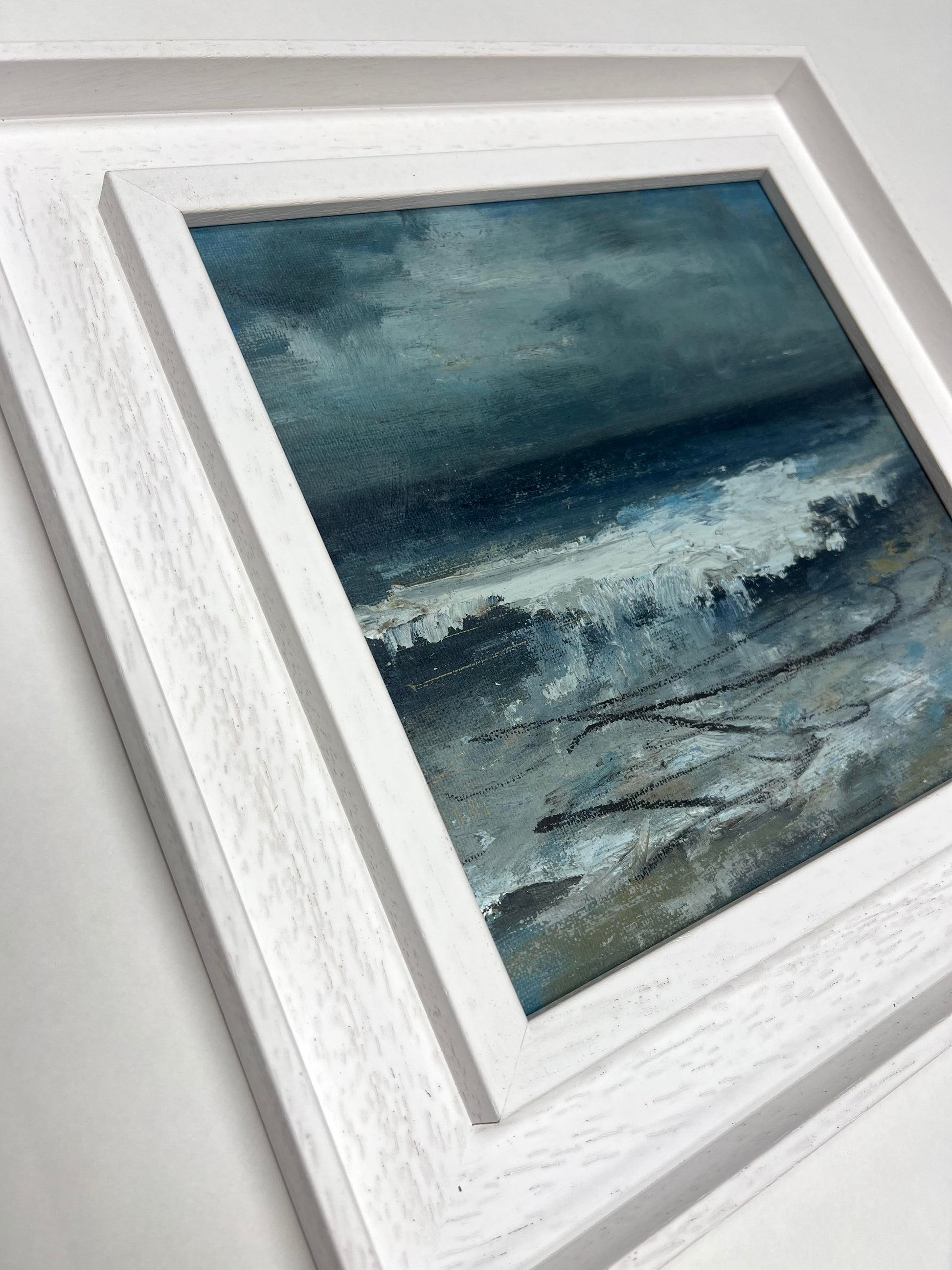 Framed in white solid wood frame.
